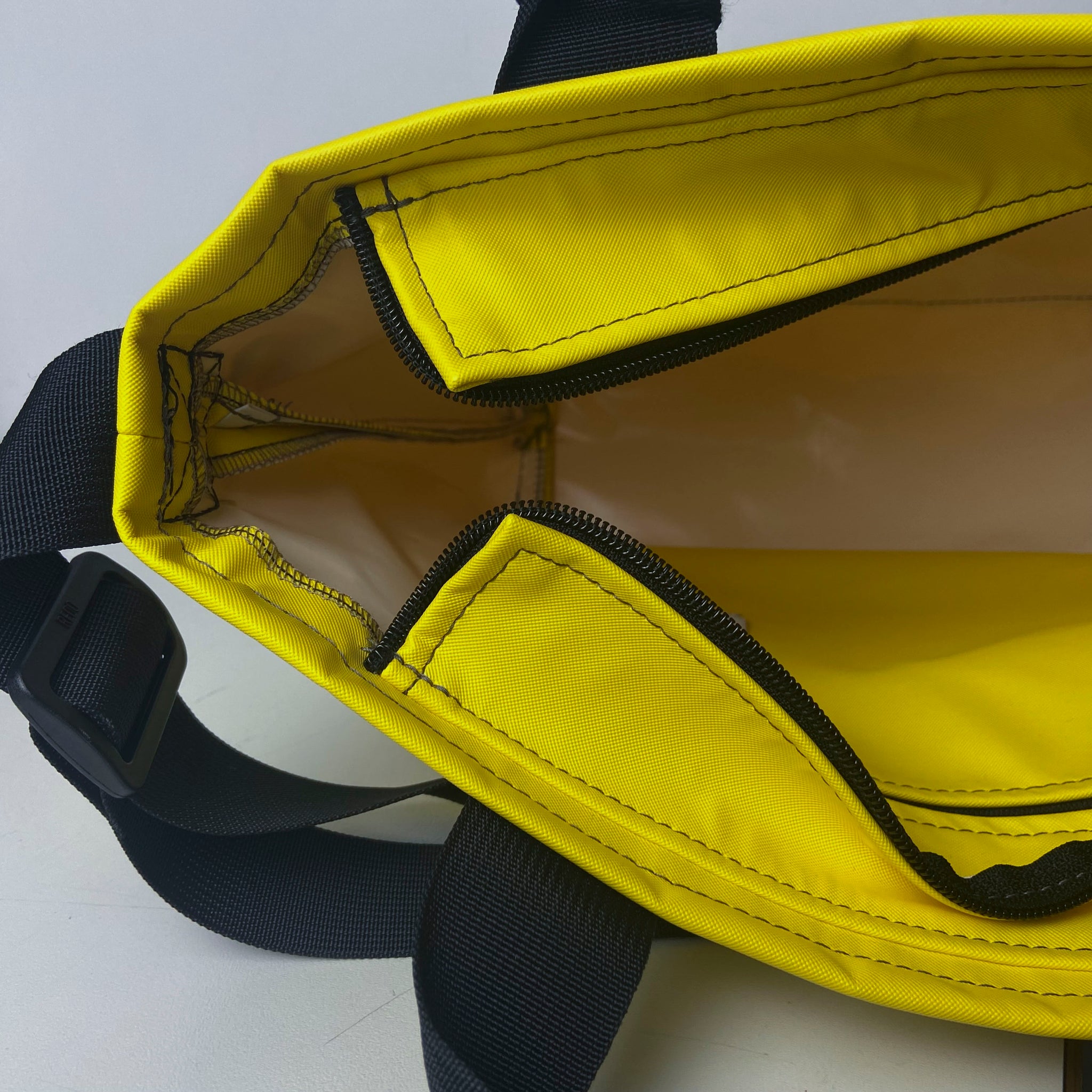 Ogni Articolo è un pezzo unico, realizzato a mano nei laboratori dell'azienda Trentina secondo i loro standard di sostenibilità utilizzando materiali di recupero, materie prime seconde, fondi di magazzino, tessuti da tappezzeria, banner pubblicitari, componenti per calzature, ecc...