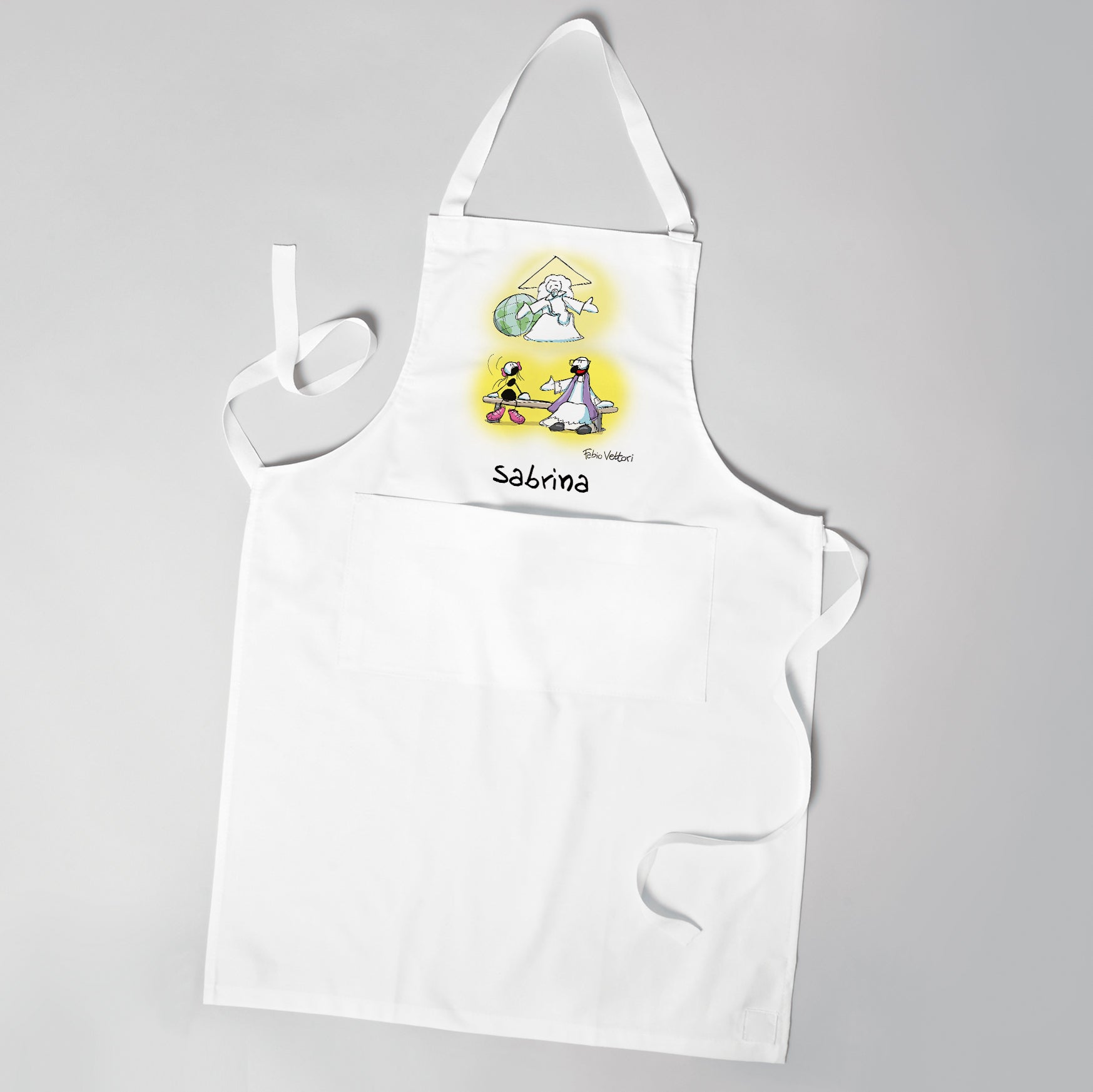 Si tratta di una stampa digitale a colori su grembiule realizzato al 100% in cotone. Il grembiule a taglia unica è munito di due grandi tasche. La misura al collo può essere regolata con la comoda fibbia.