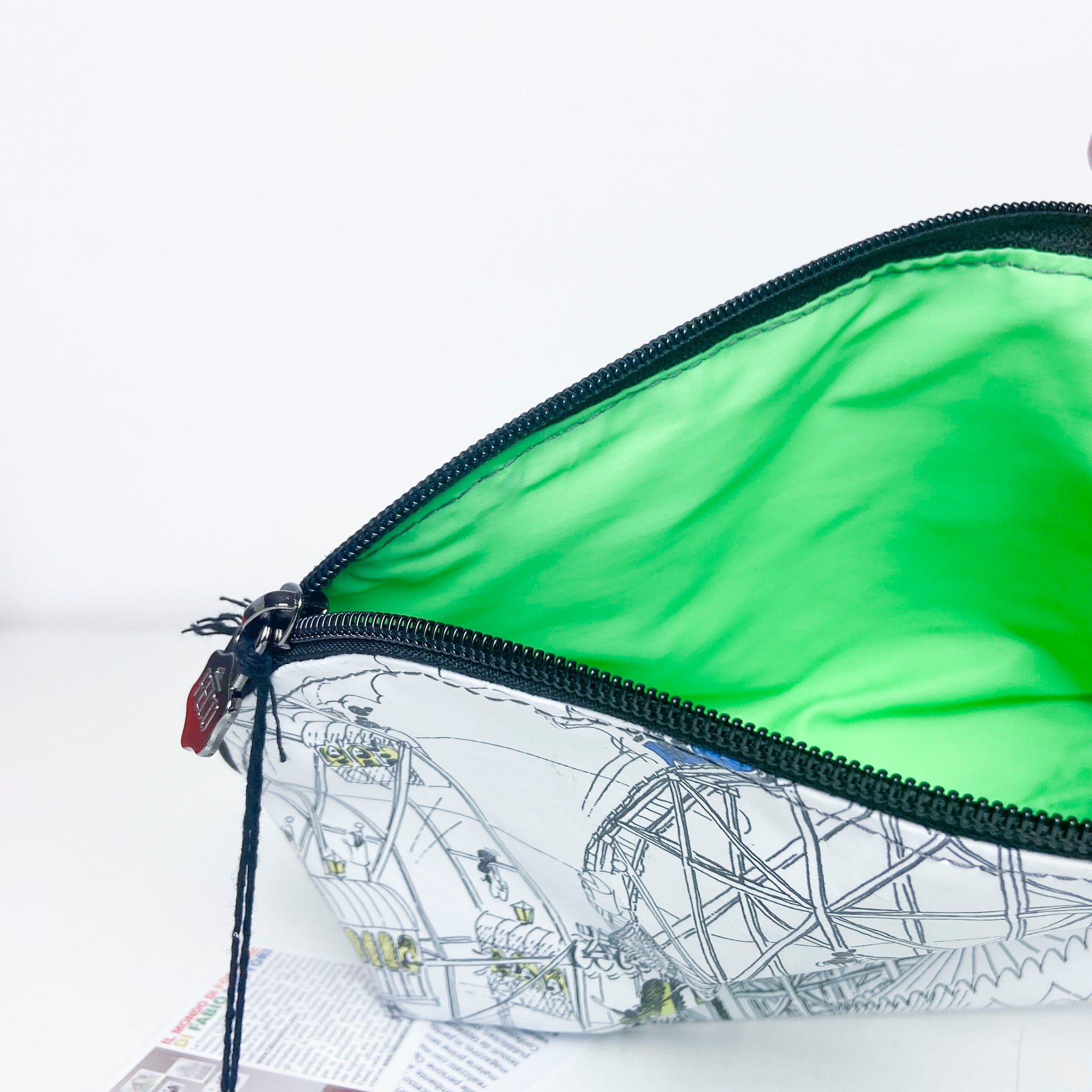 Ogni Articolo è un pezzo unico, realizzato a mano nei laboratori dell'azienda Trentina secondo i loro standard di sostenibilità utilizzando materiali di recupero, materie prime seconde, fondi di magazzino, tessuti da tappezzeria, banner pubblicitari, componenti per calzature, ecc...