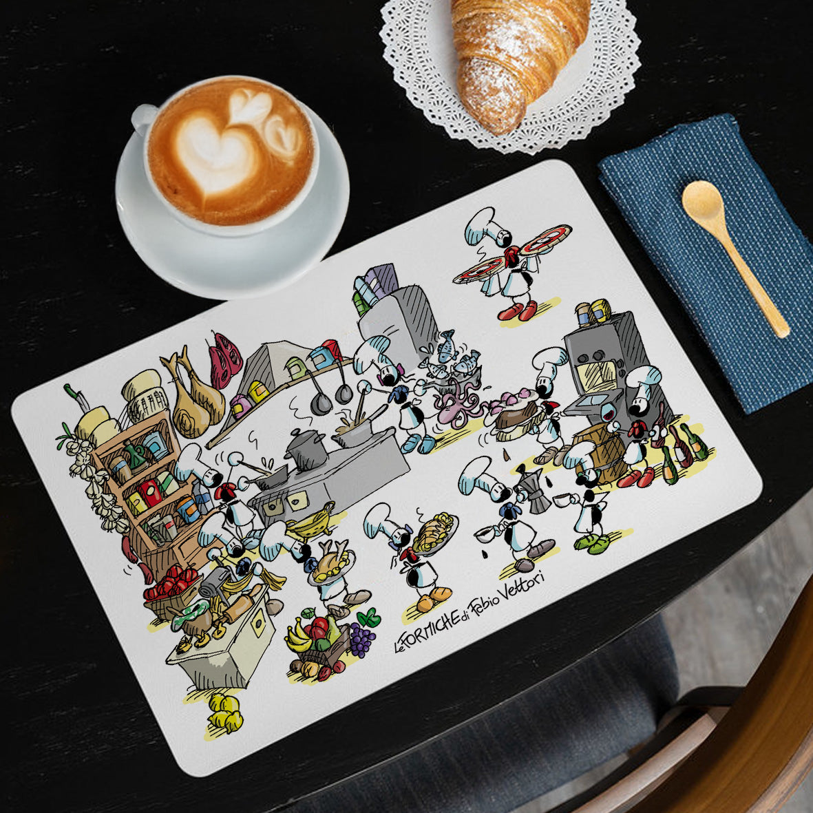 Le tovagliette americane sono un elemento versatile, ormai non più solo come set da colazione, ma adatte anche a pranzi e cene informali. Questa simpatica tovaglietta vi terrà compagnia a tavola ad ogni pasto, magari accompagnata dalle simpatiche tazze MUG delle Formiche di Fabio Vettori!