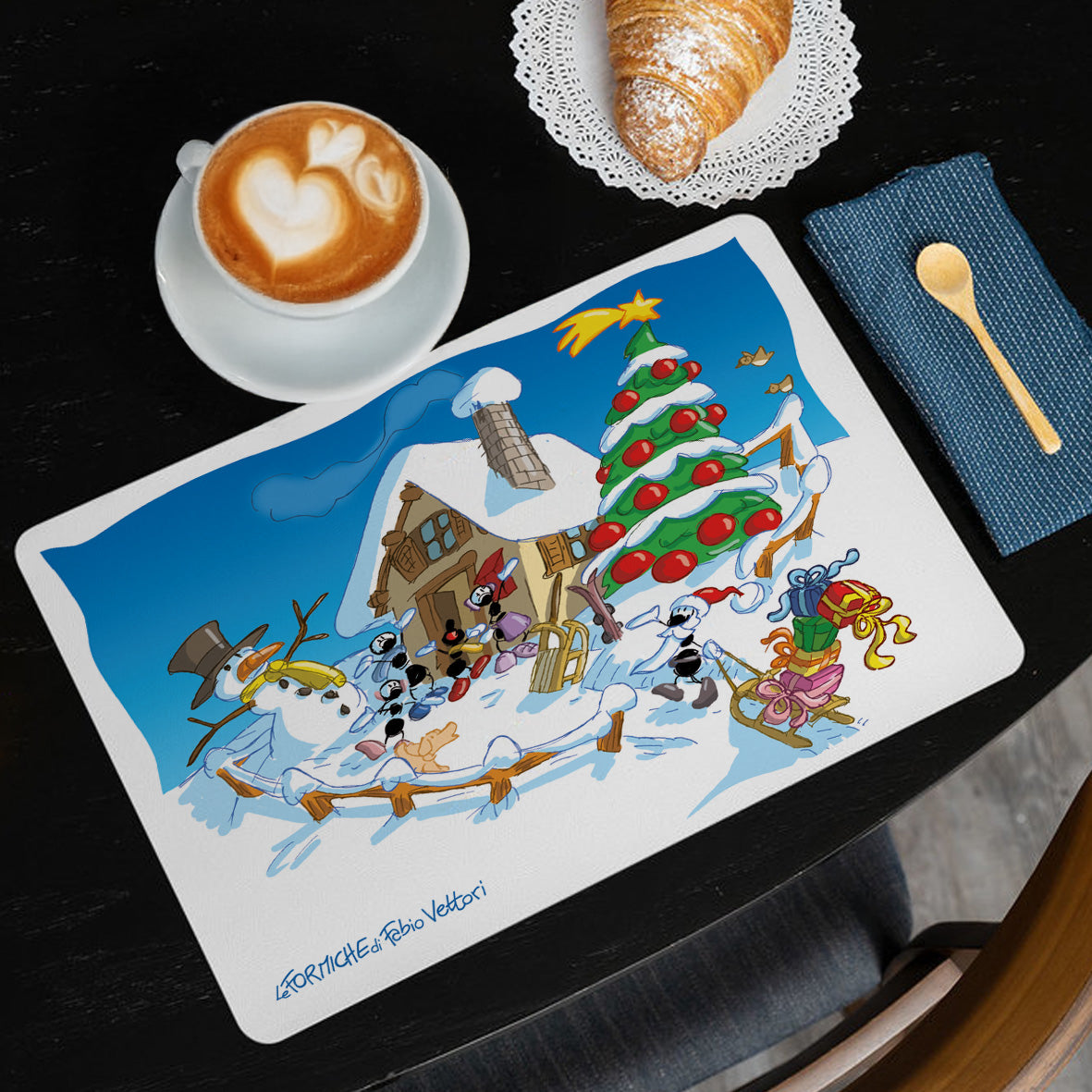 Le tovagliette americane sono un elemento versatile, ormai non più solo come set da colazione, ma adatte anche a pranzi e cene informali. Questa simpatica tovaglietta vi terrà compagnia a tavola ad ogni pasto, magari accompagnata dalle simpatiche tazze MUG delle Formiche di Fabio Vettori!