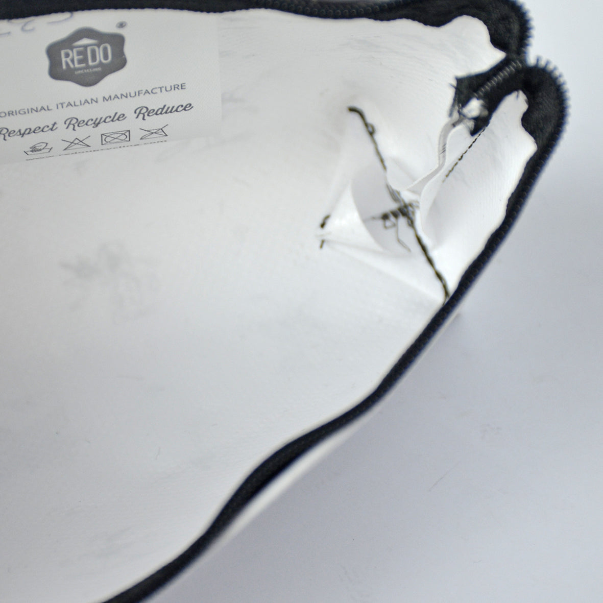 Each item is a unique piece , handcrafted in the laboratories of the Trentino company according to their sustainability standards using recycled materials, secondary raw materials, warehouse stock, upholstery fabrics, advertising banners, footwear components, etc...
