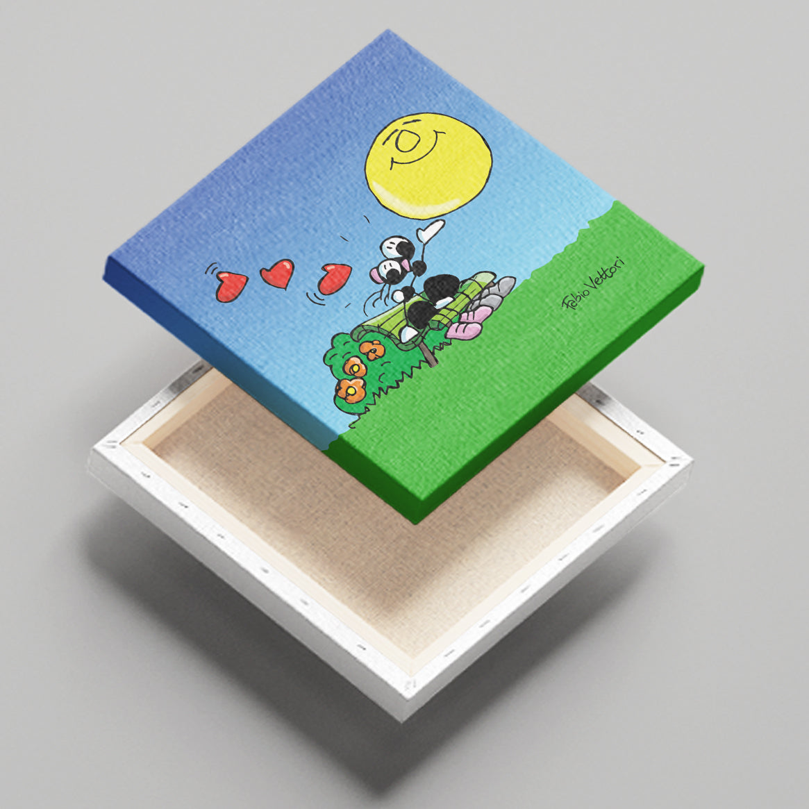These are screen prints on natural, 100% biodegradable canvas, which is then manually stretched on a 5 cm thick wooden frame. They are produced and packaged in Italy and are available in two different formats: 20x20cm or 40x40cm. But on request they can also be made in large and personalized formats! It is very light and easy to hang thanks to the gold-coloured hook.