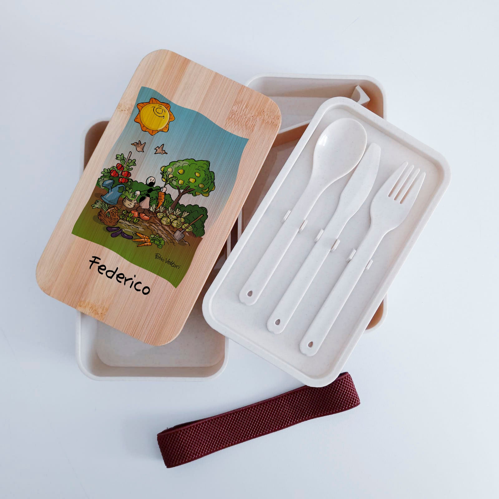 Scatola Porta Pranzo con coperchio in bambù e Posate Personalizzata soggetto "Agricoltore"