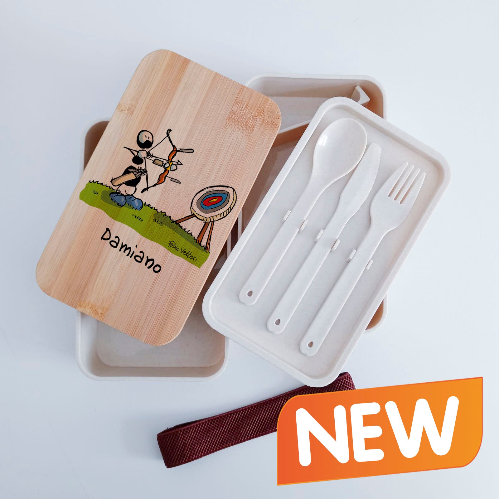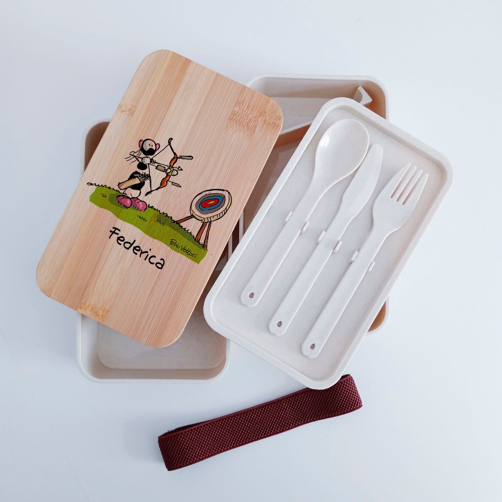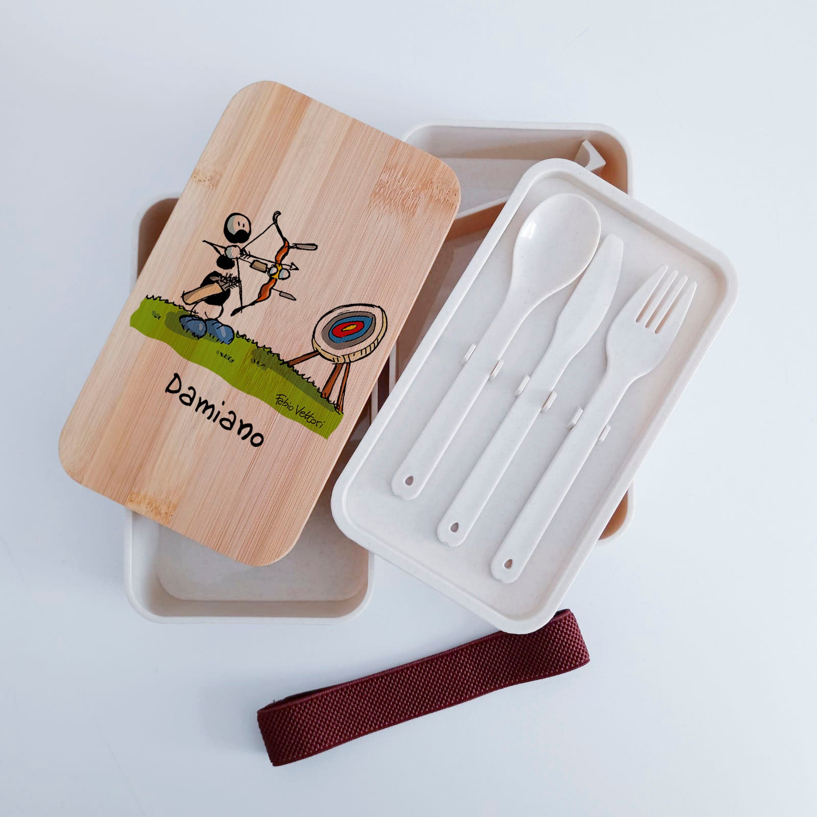 Scatola Porta Pranzo con coperchio in bambù e Posate Personalizzata soggetto "Tiro con l'arco"