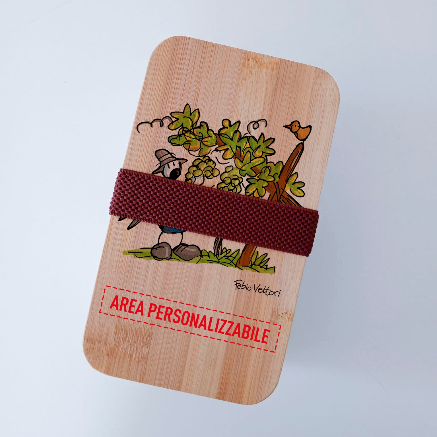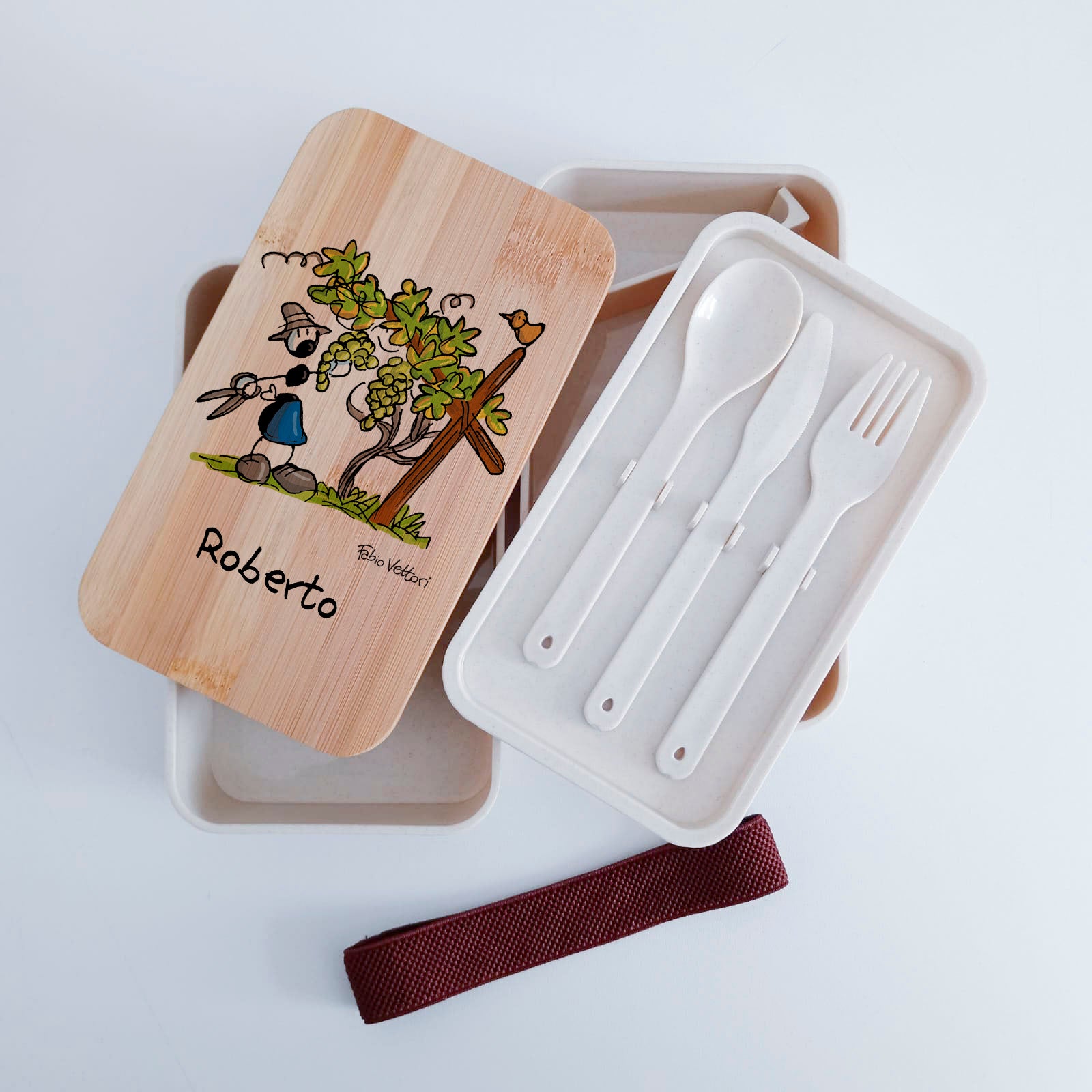 Scatola Porta Pranzo con coperchio in bambù e Posate Personalizzata soggetto "Viticoltori"
