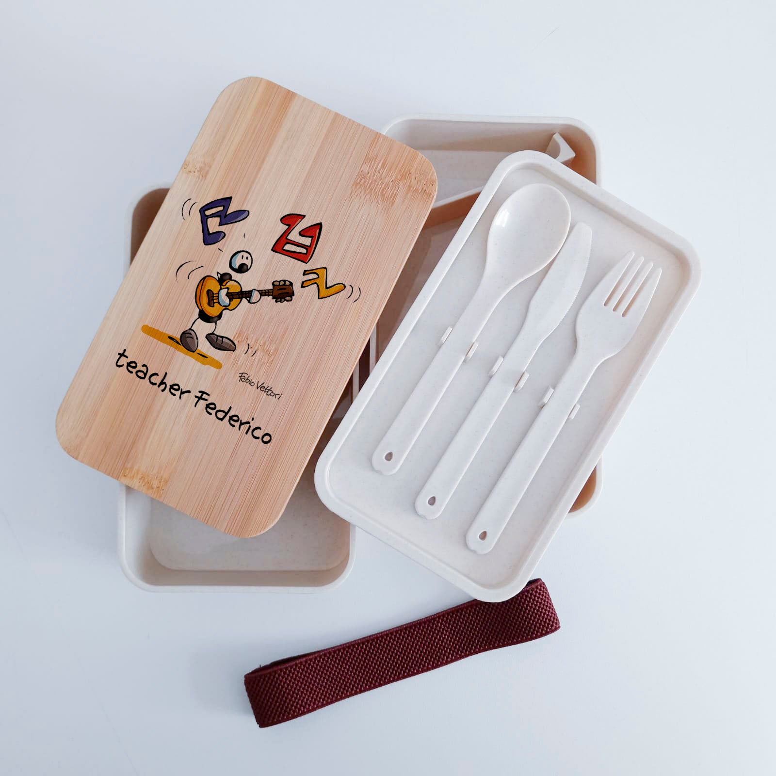 Scatola Porta Pranzo con coperchio in bambù e Posate Personalizzata soggetto "Chitarrista"