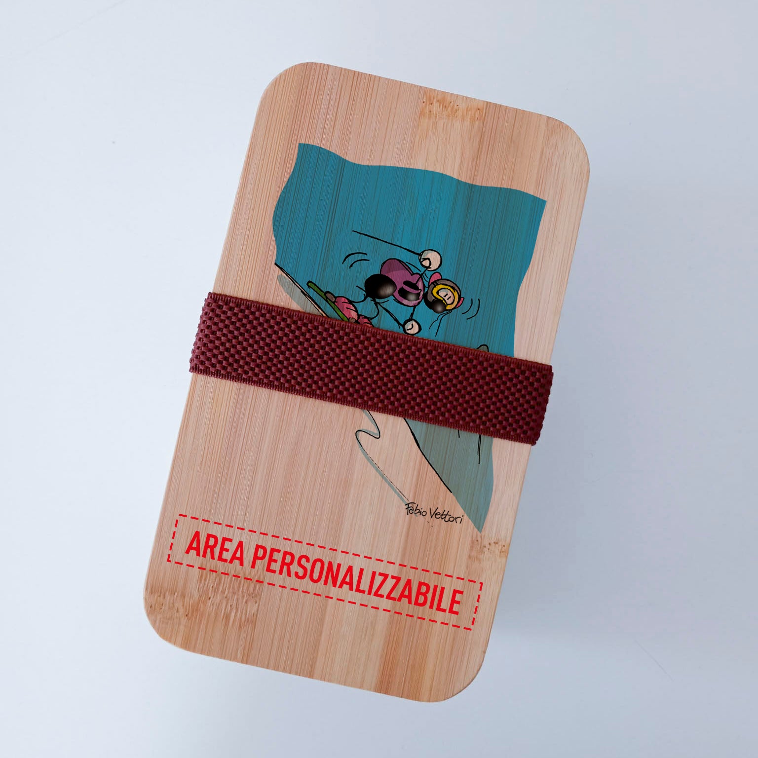 Scatola Porta Pranzo con coperchio in bambù e Posate Personalizzata soggetto "Sciatori"